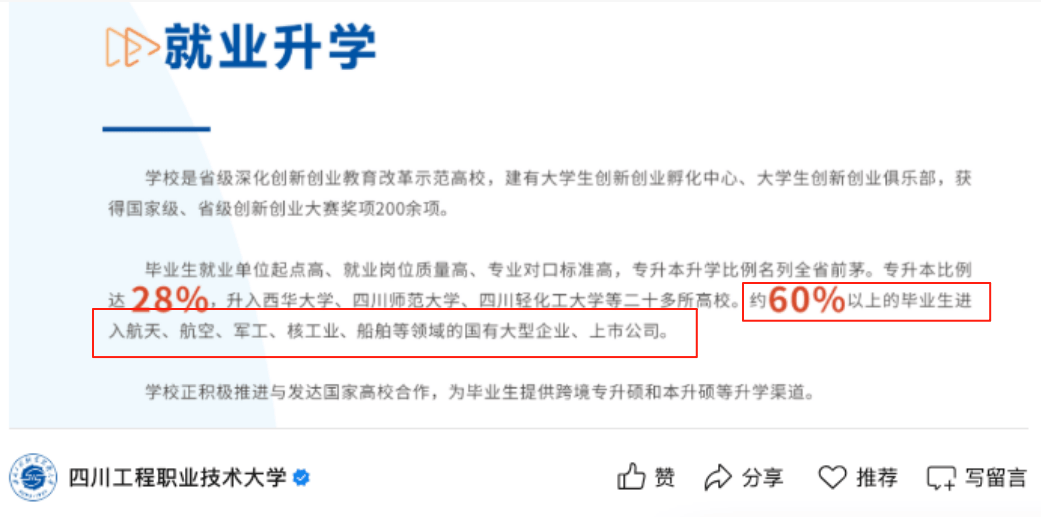 四川工程职业手艺大学位于四川省德阳市,学校前身为建立于1959年的第一机械工业部德阳沉型机械制制学校,后历经多个成长阶段,正在2024年1月经教育部同意成为四川工程职业手艺大学。良多家长和考生看到这个校名可能会下认识感觉这所高校并不怎样样,但若是你实的这么想,那就大错特错了!学校最新发布的就业数据显示:60%以上的结业生都能进入航空航天、军工、核工业、船舶等范畴的国有大型企业和上市公司。