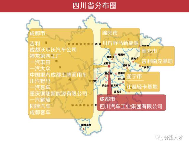 从这张分布图中能够看出,四川的车企出产制制核心次要集中正在成都这一块,成都的汽车财产次要集中正在龙泉驿何处,谈到成都的主要性,一汽公共汽车无限公司总司理安铁成已经说过:“成都是一汽公共继之后的第二个出产,它的建成对于一汽公共来说,其意义不只仅是产能的添加,更具有正在中国西部区域的计谋性感化。”!
